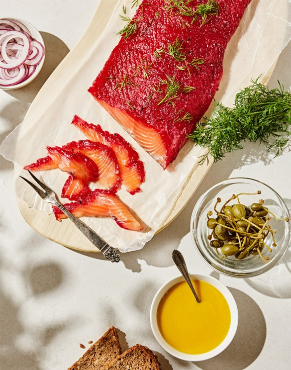 Dobrze przetrzyj łososia i podawaj w cienkich plasterkach wraz z chlebem żytnim, sosem musztardowym, czerwoną cebulą w plasterkach, koperkiem i kaparami.